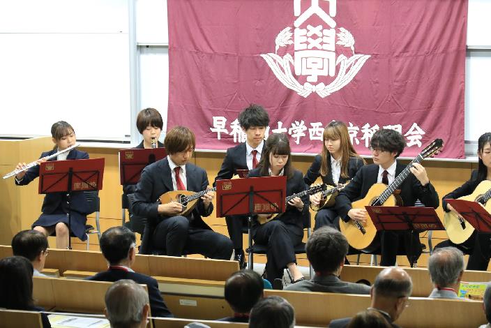 早大ハイソサエティ・オーケストラクィンテットの演奏会で幕を開けた第18回定時総会は、引き続き会長挨拶、来賓祝辞に続いて議事に移り、会長の留任、新役員の選任を含めてすべての議案が了承されました。