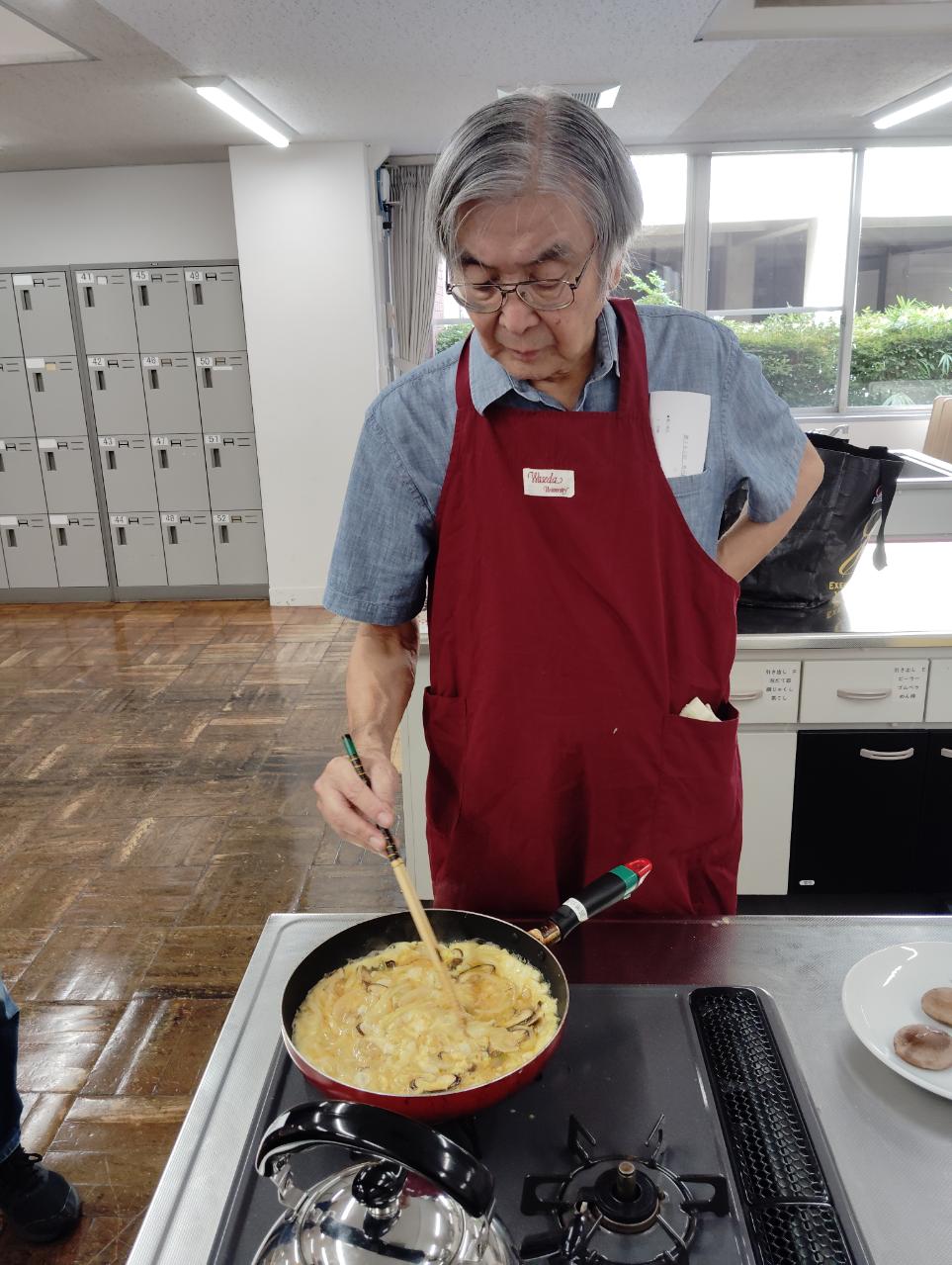 特別調理は、家庭で腕を振るっておられる高木さんの見せ所。焼けた卵をベースに、薄切りの玉ねぎ、椎茸、ニラにオリーブオイルを入れ、塩、胡椒を加え出来上がりですが、その味の調え方が絶妙です。