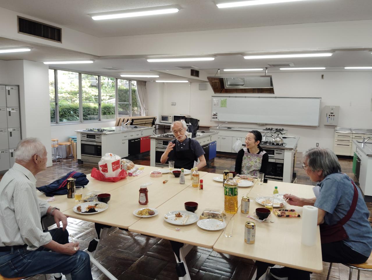 例会を5月28日に田無公民館実習室で開催。紅一点の佐藤さんを含め出席者8名。メニューは店で購入したおまかせ弁当に、「ほうれん草の胡麻和え」、「小松菜のからし醬油和え」と「味噌汁」作りです。