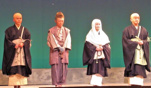 そしてわが稲門会仲間の女優・有田佳代さんは、その二人の末娘・覚信尼(かくしんに)という今作でも重要な役どころ。母の恵信が病気の長女を支援するため越後に旅立った後、父・親鸞の京での布教をかたわらで支えます。「尼僧の役は初めて」とのことですが、舞台上の有田さんは法衣姿も似合っていて、よく通る声で末娘らしく親思いの真っすぐな心情を表現し、難役を見事に演じ切っていました。