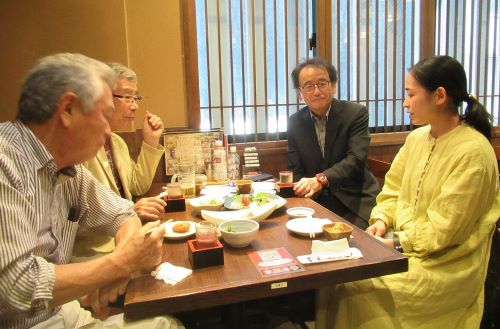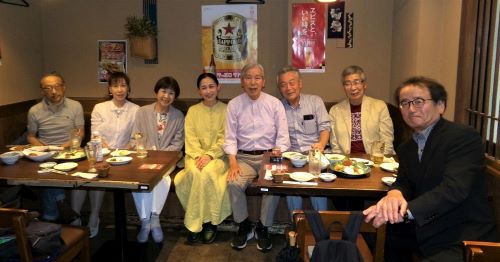 終演後多くのメンバーは、池袋駅近くの老舗居酒屋に移動。あとから駆けつけてくれた有田さんをねぎらいつつ、明日以降も続く舞台での奮闘を祈念して乾杯しました。なお、次回の「観劇の会」は11月21日(木)、武蔵野市民文化会館で行われる前進座公演『雪間草(ゆきまそう)~利休の娘お吟~』を観る予定です。