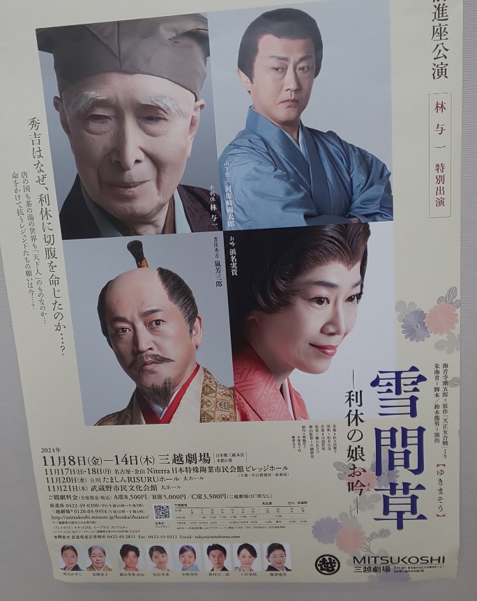 前日までの急な冷え込みから一転、小春日和となった11月21日、武蔵野市民文化会館で行われた前進座公演「雪間草(ゆきまそう)―利休の娘お吟―」を総勢12人で鑑賞。今回、当会会員の女優・有田佳代さんは他の公演で地方巡演中のため出演は叶いませんでしたが、時代劇スターとして映画やテレビ、舞台で長年活躍してきた林与一さんが、初めて前進座公演に参加するとあって期待値満タンで出かけました。