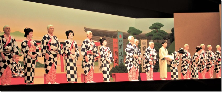 舞台には浴衣すがたで二十数名の役者が勢揃いだ。鉦(かね)や太鼓そして三味線の音色に合わせて、「かっぽれ、かっぽれ」の大合唱が湧きおこり、浴衣すがたの男優女優らが踊り出す。観客席からも合いの手拍子が鳴りひびく、観客と舞台が一体となって織りなす壮大なドラマが拡がっていく。