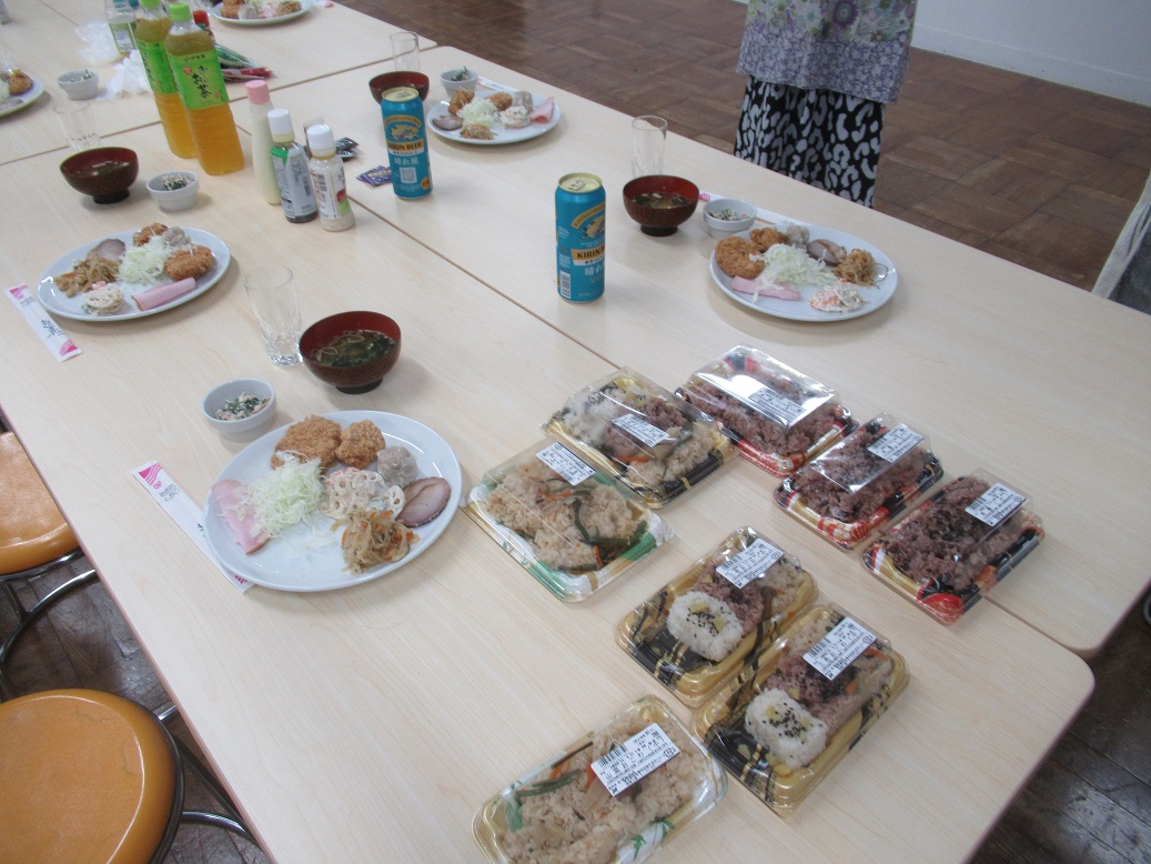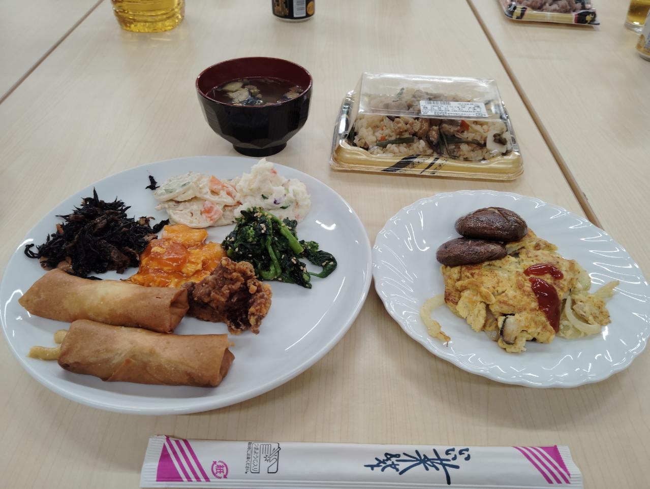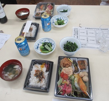 白米に変えておこわが加わり、ロースハムスライス、合鴨のパストラミ 、鯵フライ、焼売、春巻き、ほうれん草の白和え、れんこんサラダ、酢の物、わかめスープ、ふきの煮物などをみんなで手際よく盛り付ける。バラエティ―に富んだ総菜の出来上がりにウォーの声が上がる。