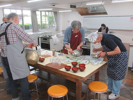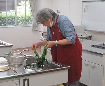 例会を5月28日に田無公民館実習室で開催。紅一点の佐藤さんを含め出席者8名。メニューは店で購入したおまかせ弁当に、「ほうれん草の胡麻和え」、「小松菜のからし醬油和え」と「味噌汁」作りです。