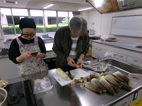 杉中さんから時折、家庭栽培園から取り立ての新鮮な野菜の差し入れがあり、調理に重宝させていただいていますが、この日は何と掘りたての大きなタケノコの差し入れがあり、みな大喜び。茹でた美味しいタケノコを全員、お土産に持ち帰りました。