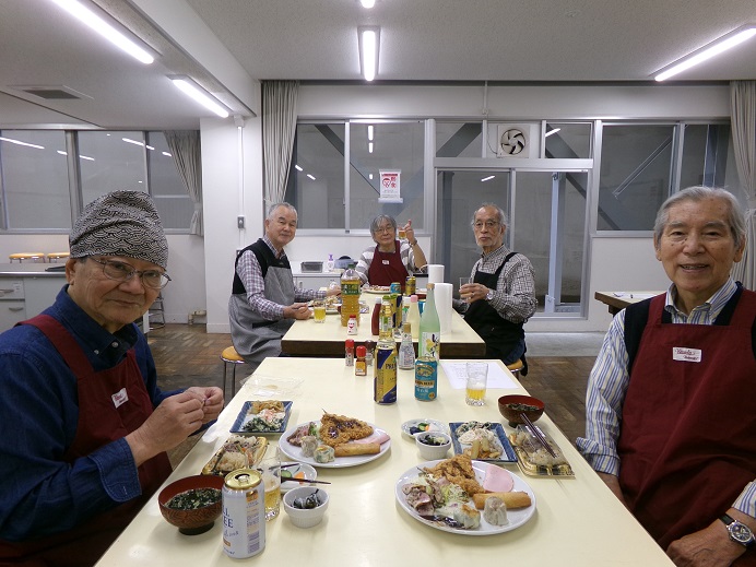 今回は体調を崩した会員が多く、参加者は5人。ちと寂しい思いもあったが、高齢メンバーが多いだけに通院は生活の一部。出席者だけで、思いっきり秋の味覚を楽しんだ。料理は、エビチリソース、エクレア、れんこんサラダ、ポテトサラダ、ほうれん草の白和え、他。て寺本会員の高齢者水泳談義で盛り上がった。