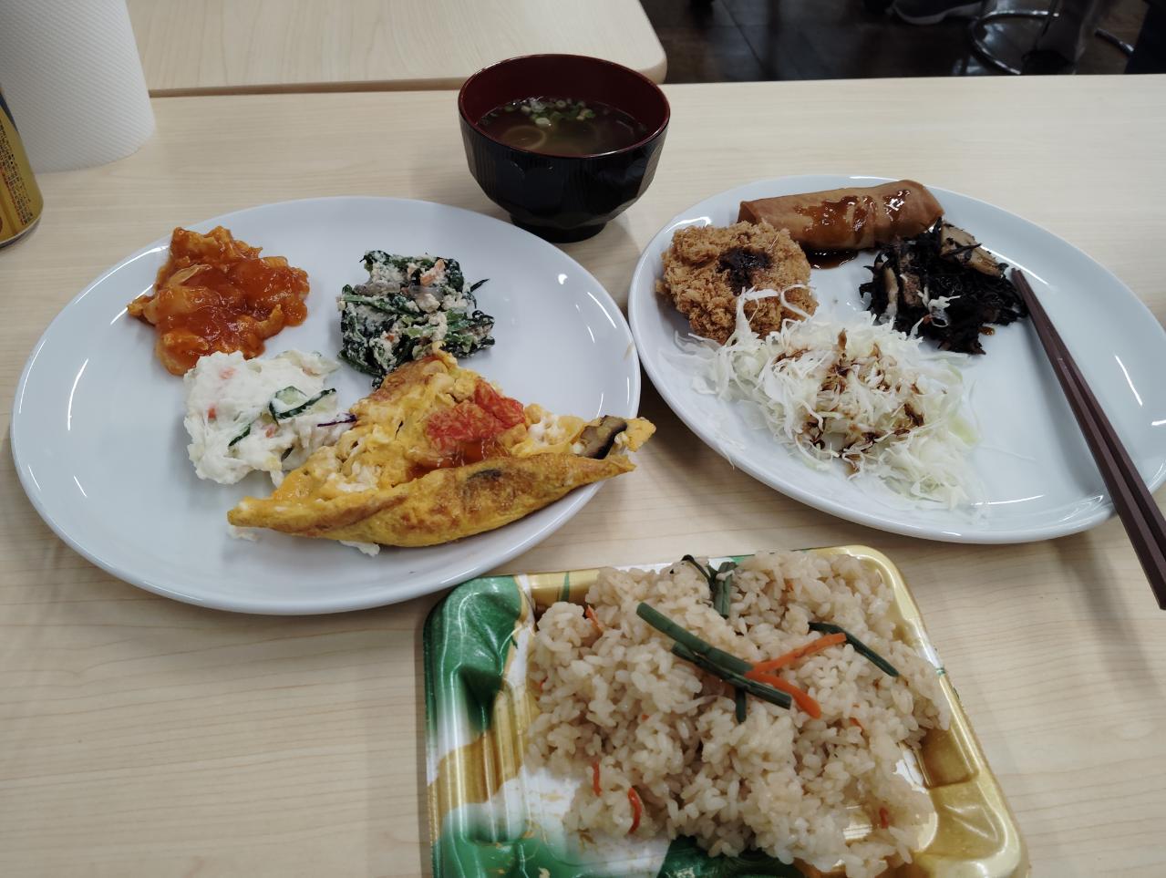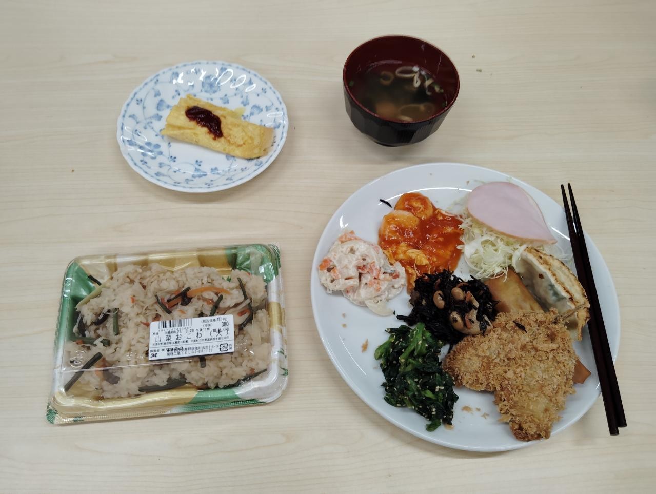 弁当を引き取る前に、副菜のカボチャサラダやひじきの煮物などと飲み物を仕入れました。