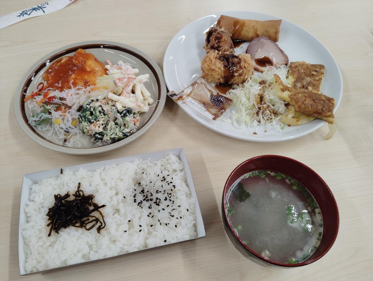 マイ弁当のメニューも、春巻き、エビチリソース、マカロニサラダ、ほうれん草の白和え、鶏の唐揚げ、焼豚、蟹クリームコロッケ。最後のデザートはジャンボシュークリームと豪華三昧!