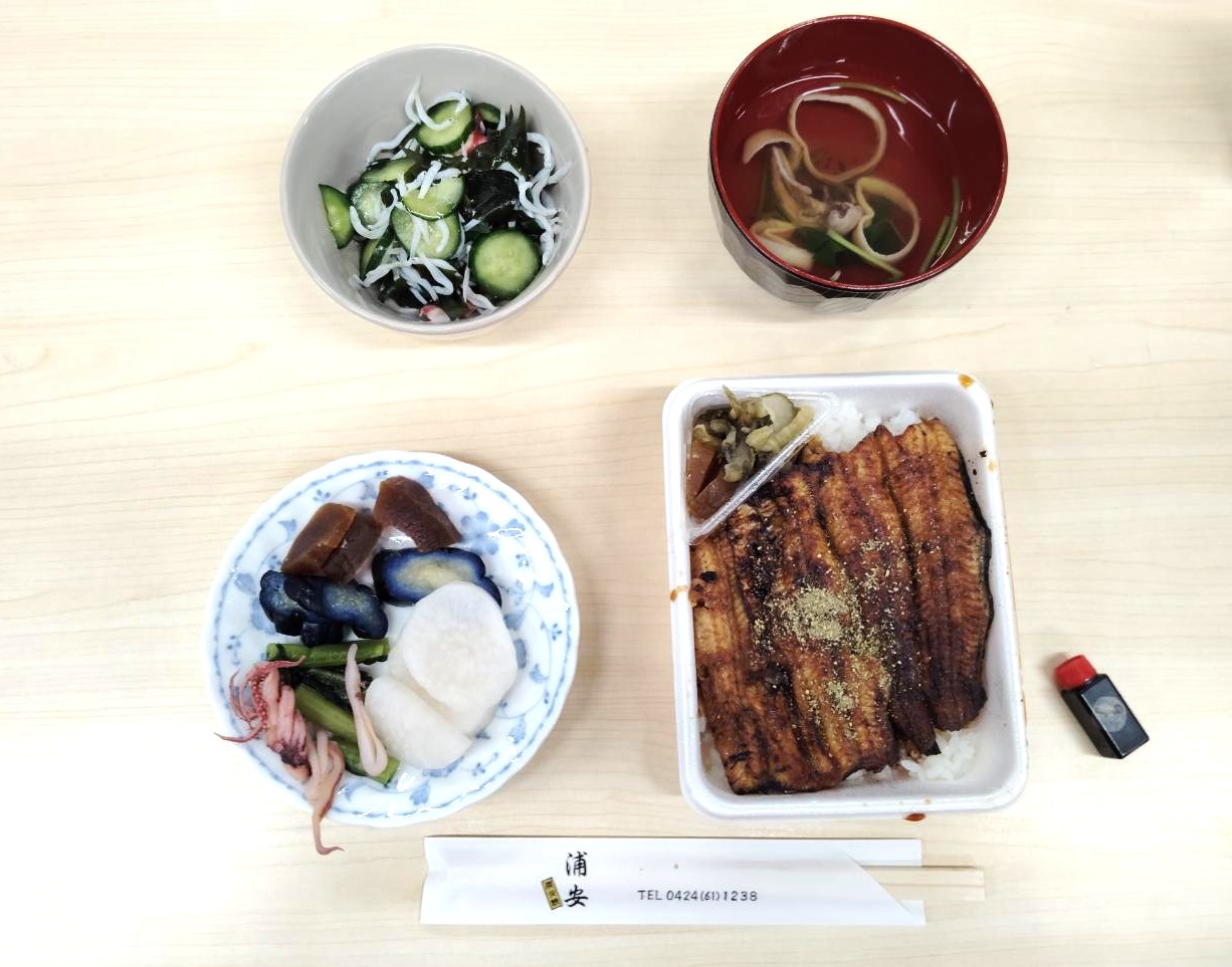 今日は何と、うなぎ弁当と三杯酢だ。うなぎは柳沢駅近くの評判の「浦安」の炭火焼き弁当だ!美味しい昼ご飯となる。
