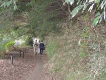 街路樹のハナミズキは既に色づいている。都心よりは一足早く季節が進んでいるようである。大妻女子大学の裏手を右に入ると石段が現れた。これが「よこやまの道」の唐木田口である。石段を登りきるといきなりでこぼこの山道となる。しかしすぐに元の舗装道路と合流する。よこやまの道は道路を横断した先につながっている。