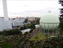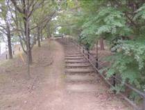 道路を横断したところに道標と案内板が設置してあり、階段が始まる。階段を登りきるとややきつい登りとなるが、やがて見晴らしのよい場所に出る。ガスタンクの向こうに多摩ニュータウンの街並みが広がっている。