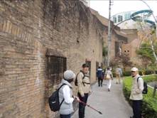 更に数十m進むと右手の展望が開け、町田の市街とその先に長く裾を引いた大山の端麗な姿を望むことができた。やがて道は下り坂となり、多摩清掃工場前の交差点で車道と合流した。そこから先はしばらく歩道を歩くことになった。左手の崖の上には多摩市の総合福祉センターと温水プールがあるが、下から見上げるとまるで中世の西洋の城壁のようである。右手は東京国際ゴルフ倶楽部である。