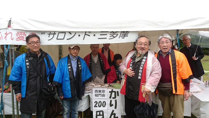 我が西東京稲門会は大隈庭園内の三多摩支部模擬店「サロンド三多摩」に参加し恒例の西東京名物「かりんとう」を販売しました。三多摩支部の各参加者は所属する稲門会だけでなくサロンド三多摩全体の販売に相互に努力し三多摩の結束を示しました。