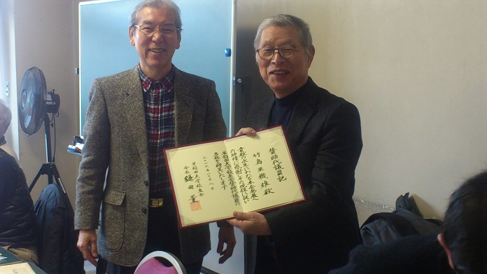 1月7日、役員会に先立ち「早稲田大学校友会賛助代議員名称」が、鎌田校友会会長(総長)に代わって古賀会長より竹島亜機雄顧問(前会長)に贈呈されました。