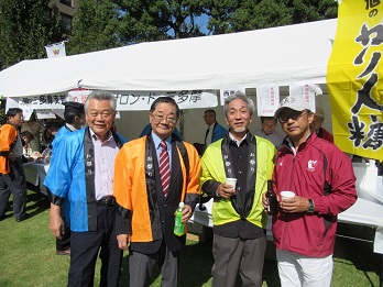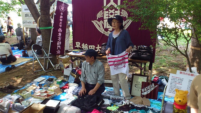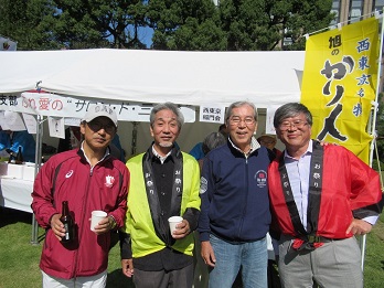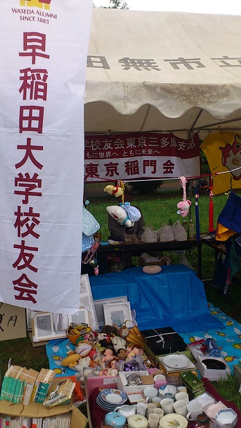 当日は、他稲門会では町田が饅頭を、小平がつまみを、狛江、国分寺、稲城、立川、調布がビール・日本酒を出品し、互いに協力し販売をしました。ただ日本酒は完売したものの、天候のせいでビールの売れ行きが芳しくなかった事が残念でしたが今回も他の三多摩稲門会との交流を深めることが出来ました。