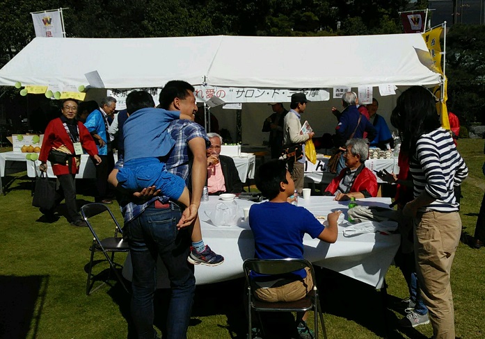 初めての出会いであってもWASEDAのつながりは直ぐに打ち解け、ホームカミングデイ式典終了後には来場者が増え庭園内でも懐かしさと友情を確かめ合う皆さんで賑わいました。販売参加者の努力もあり午後1時過ぎにはかりんとうは完売、2時にはサロンド三多摩全体の模擬店も完売しました。
